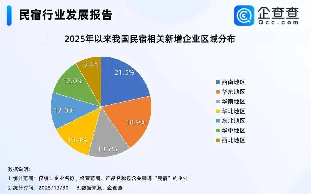 38.3万家现存民宿企业(企查查2025年底数据),8.6万家2025年新注册企业,西南地区以21.5%的占比反超华东成新热点——民宿行业到底是凉了,还是在偷偷洗牌?