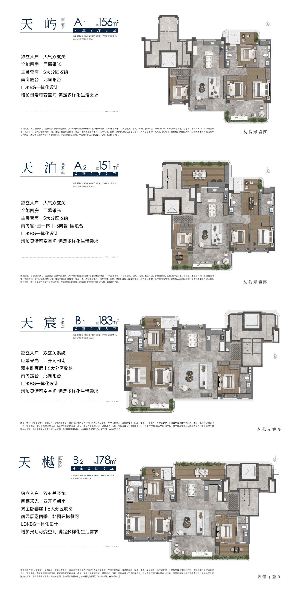 项目主力户型为建面约151-188㎡的超进化四代浮岛洋房,以及建面约198-213㎡的栋式天地叠院。无论是追求阔绰空间感的改善家庭,还是向往有天有地私密生活的塔尖人士,这里都有你的理想选择。这些苏州湾豪宅户型,充分考虑了现代家庭对空间与功能的需求。