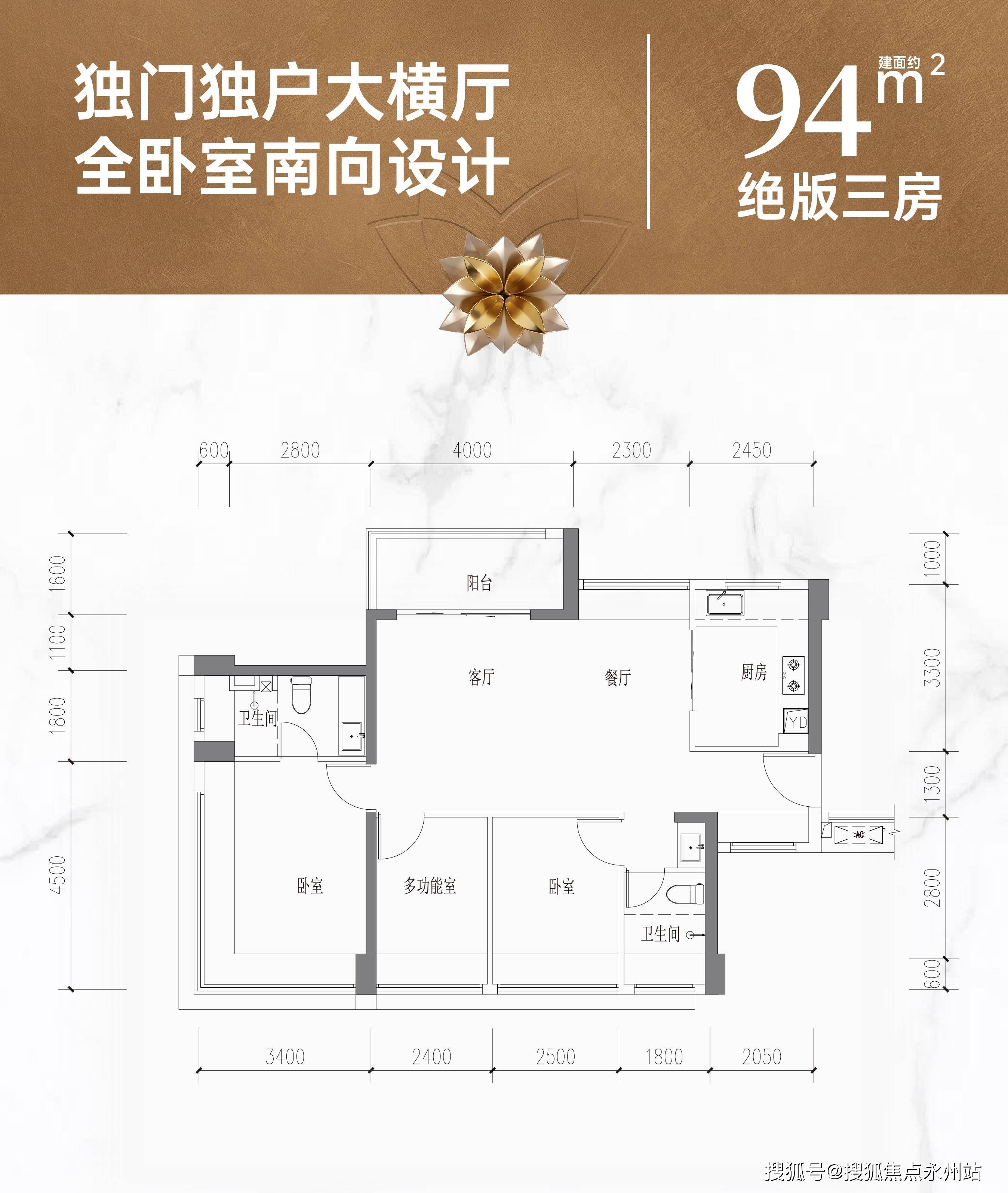 94㎡的3房2厅2卫:独门独户设计,隐私性极强;横厅布局可灵活改造为4房,得房率高达95%,空间利用率拉满,适配刚需改善、多成员家庭,东南/西南朝向。