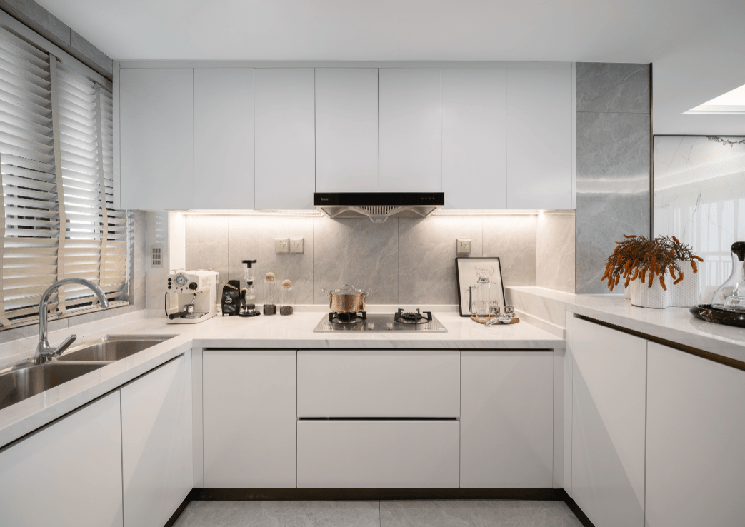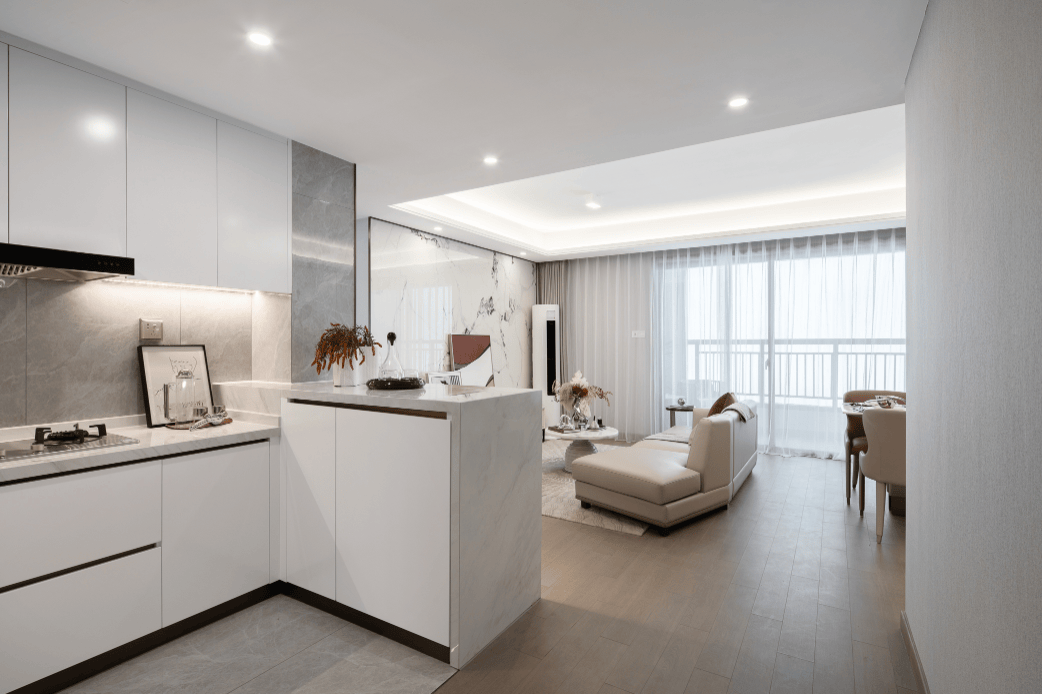厨房是L型布局,有意思的是在侧边做了一个岛台,这个设计在约75㎡的户型中非常少见。